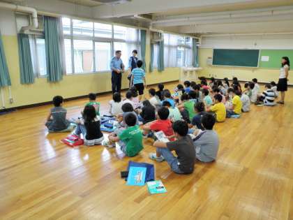 4年生が本日、目黒警察署の警察官の方から、「警察署や警察官の仕事」お話を伺い、社会科の学習に役立てました。警察官の方からいただいた資料を下に、お話を伺い、これまで知っていたことと、初めて聞くことなど、真剣に学ぶことができました。