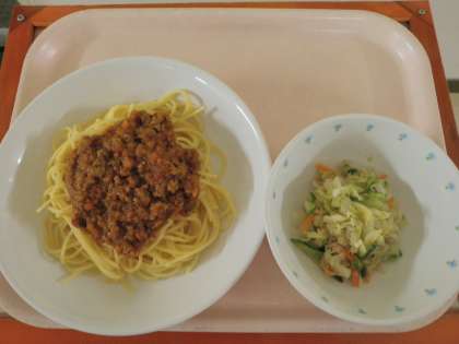 6月25日 スパゲティミートソース キャベツのごまドレッシング 牛乳 公開日 2014/06/25 更新日 2014/06/25 今日の給食 《こんだて》 ★スパゲティカレーミートソース ★キャベツのごまドレッシング ★牛乳 《食材の産地》 豚ひき肉(鹿児島)、にんにく(青森)、しょうが(高知)、玉ねぎ(兵庫)、にんじん(千葉)、パセリ(長野)、キャベツ(秋田) いいね(0)