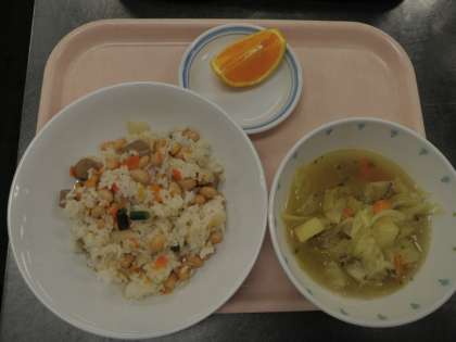 7月10日 大豆ピラフ カレー入り野菜スープ バレンシアオレンジ 牛乳 公開日 2014/07/10 更新日 2014/07/10 今日の給食 《こんだて》 ★大豆ピラフ ★カレー入り野菜スープ ★バレンシアオレンジ ★牛乳 《食材の産地》 豚肉(福岡)、玉ねぎ(兵庫)、にんじん(青森)、いんげん(青森)、にんにく(青森)、セロリ(長野)、じゃがいも(静岡)、キャベツ(青森)、パセリ(長野)、オレンジ(和歌山) いいね(0)