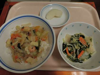 9月5日 中華丼 こんにゃくサラダ なし 牛乳 公開日 2014/09/05 更新日 2014/09/05 今日の給食 《今日の献立》 ●中華丼 ●こんにゃくサラダ ●梨 ●牛乳 《食材の産地》 にんにく(青森)、しょうが(高知)、にんじん(北海道)、玉ねぎ(北海道)、白菜(長野)、チンゲン菜(静岡)、水菜(埼玉)、もやし(静岡)、豚肉(鹿児島)、えび(マレーシア)、いか(ペルー)、梨(長野) いいね(0)