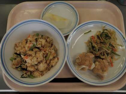 9月25日 中華風おこわ えびしゅうまい 糸寒天の中華風サラダ 牛乳 公開日 2014/09/29 更新日 2014/09/29 今日の給食 《今日の献立》 ●中華風おこわ ●えびしゅうまい ●糸寒天の中華風サラダ ●りんご ●牛乳 《食材の産地》 豚ひき肉(鹿児島、熊本)、ほたて貝柱(北海道)、たけのこ水煮(熊本)、えび(マレーシア)、りんご(青森)、にんじん(北海道)、玉ねぎ(北海道)、しょうが(高知)、きゅうり(岩手)、もやし(栃木) いいね(0)