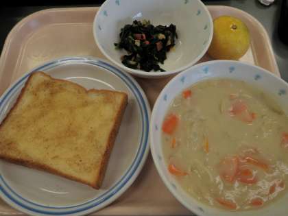 9月30日 セサミトースト ホタテチャウダー ほうれん草のソテー みかん 牛乳