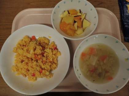 10月3日 パエリア 豆のスープ マセドニア 牛乳 公開日 2014/10/03 更新日 2014/10/03 今日の給食 《今日の献立》 ●パエリア ●豆のスープ ●マセドニア ●牛乳 《食材の産地》 にんにく(青森)、玉ねぎ(北海道)、にんじん(北海道)、赤ピーマン(千葉)、キャベツ(岩手)、セロリ(長野)、パセリ(長野)、鶏肉(鳥取)、いか(インド)、えび(マレーシア)、りんご(長野) スペイン料理の献立でした。どのクラスもよく食べていました。 いいね(0)