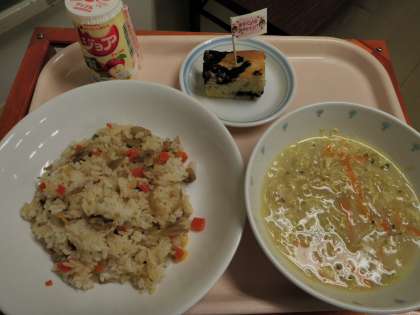 10月7日 鶏ごぼうピラフ ジュリエンヌスープ ブルーベリーケーキ ジョア 公開日 2014/10/09 更新日 2014/10/09 今日の給食 《今日の献立》 ●鶏ごぼうピラフ ●ジュリエンヌスープ ●ブルーベリーケーキ ●ジョア 《食材の産地》 鶏肉(鳥取)、ごぼう(青森)、いんげん(青森)、にんじん(北海道)、玉ねぎ(北海道)、キャベツ(千葉)、パセリ(長野)、ブルーベリー(東京)、たまご(栃木) いいね(0)