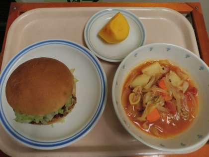 10月29日 チキンカツサンド 野菜たっぷりスープ 柿 牛乳 公開日 2014/10/29 更新日 2014/10/29 今日の給食 《今日の献立》 ●チキンカツサンド ●野菜たっぷりスープ ●柿 ●牛乳 《食材の産地》 柿(和歌山)、たまご(栃木)、豚肉(鹿児島)、鶏肉(鳥取)、キャベツ(愛知)、にんにく(青森)、玉ねぎ(北海道)、セロリ(長野)、じゃがいも(北海道)、にんじん(北海道)、パセリ(長野) いいね(0)