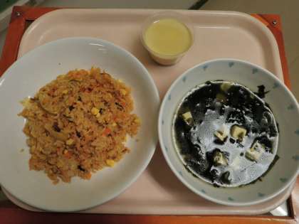 11月15日 キムチチャーハン わかめスープ 豆乳プリン 牛乳 公開日 2014/11/18 更新日 2014/11/18 今日の給食 《今日の献立》 ●キムチチャーハン ●わかめスープ ●豆乳プリン ●牛乳 《食材の産地》 にんじん(千葉)、長ねぎ(青森)、にら(高知)、豚肉(鹿児島)、たまご(栃木)、わかめ(徳島) 豆乳プリンは、プリンの牛乳を豆乳に変えて作りました。スが入らないように85度で時間をかけて蒸したのできれいな仕上がりでした。 いいね(0)