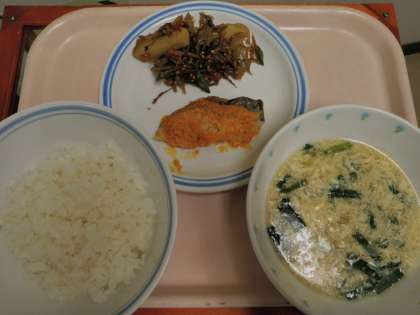12月1日 ごはん さかなのもみじ焼き じゃがいもの金平 にら玉スープ 牛乳