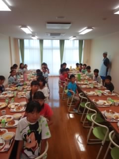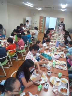 朝食です。みな、もりもり食べています。