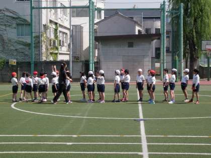 クラス替え後の初めての体育。赤白に分かれて並びました。