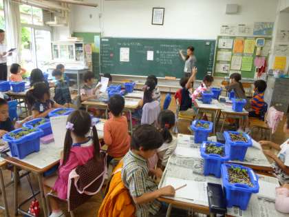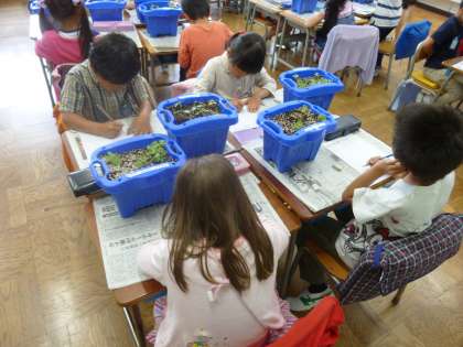 アサガオの芽の観察をしました。先生から聞いたポイントに沿ってよく観察しています。