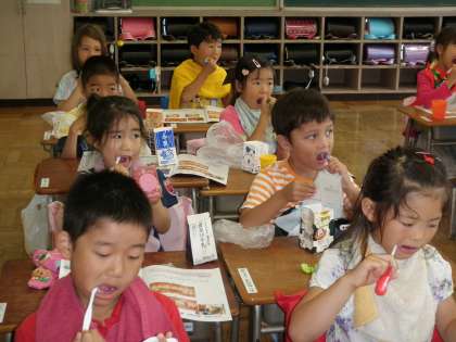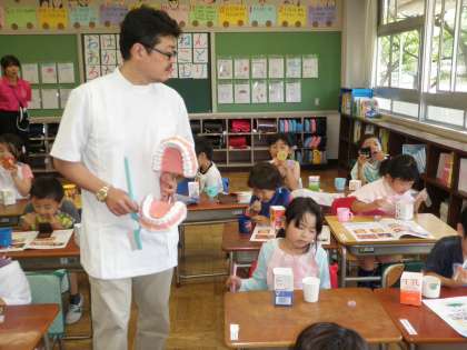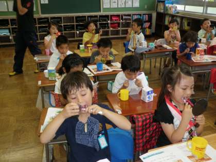 6才臼歯についてのお話とみがき方について赤染めをして確認しながらみがきました。