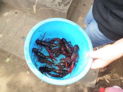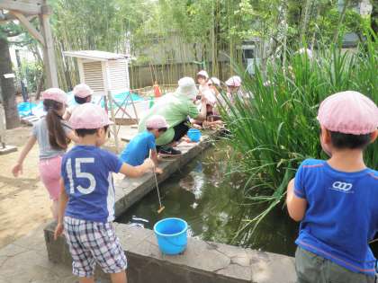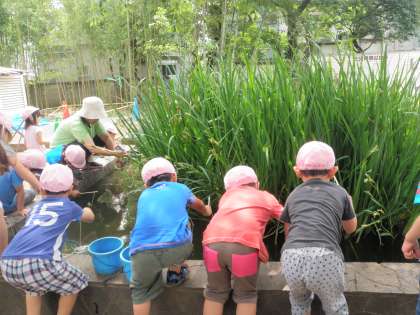 田道保育園の子ども達が、ビオトープでザリガニつりをしました。