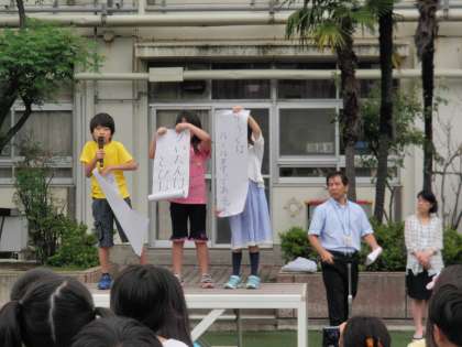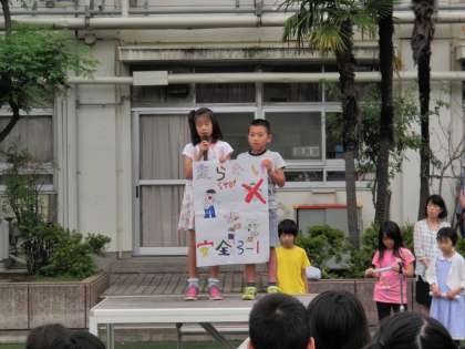 3年生から6月の生活目標「安全にすごそう」の取り組みの発表がありました。