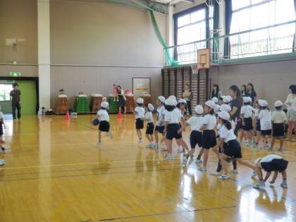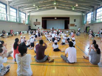 親子レク 紅白に分かれて「玉入れ」と「ボール送り」をしました。