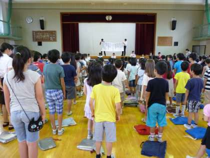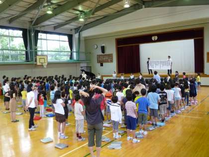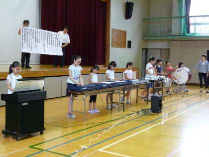 今月の音楽朝会では音楽クラブ児童の合奏に合わせ、『島人ぬ宝』を歌いました。