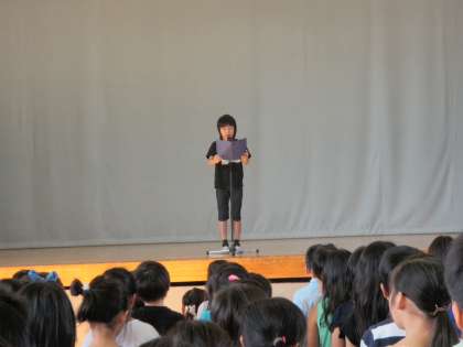 児童を代表して5年生が前期の振り返りと後期へ向けての頑張ることの作文を読みました。