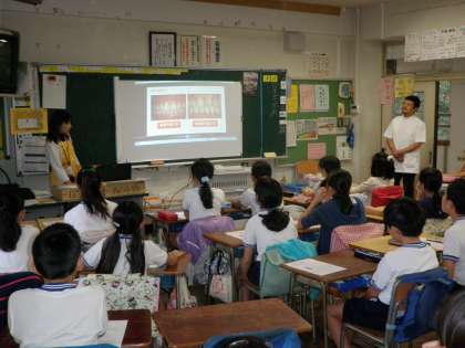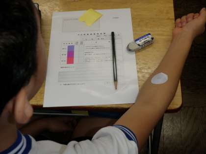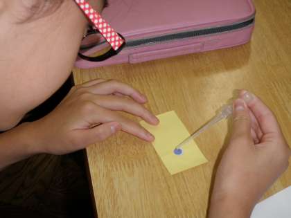 歯科校医の谷本先生と一緒に、口腔内の「むし歯」菌の活動状態をだ液を使って検査しました。