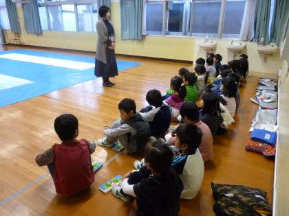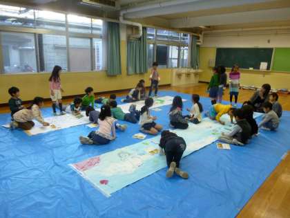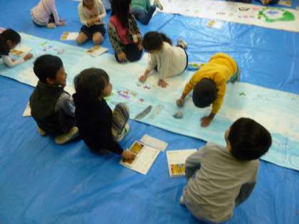 学芸会の背景画の紙の裏を利用して、みんなで楽しく絵を描きました。