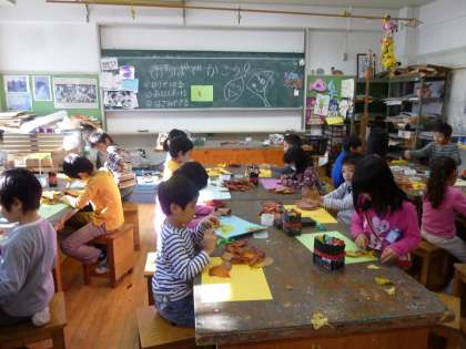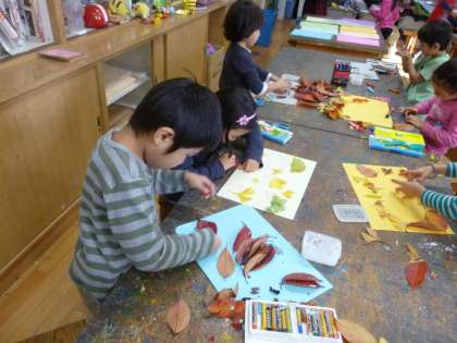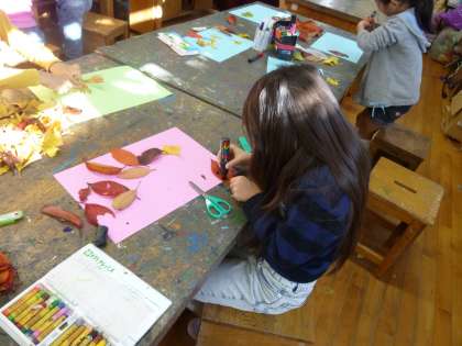 校庭で拾ってきた落ち葉を使って絵を描きました。