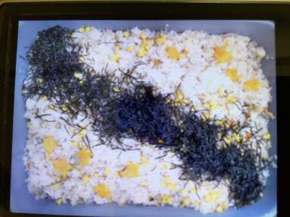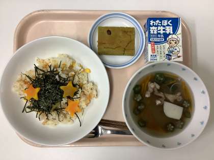 今日は七夕メニューで、ちらし寿司とスープを提供しました。ちらし寿司は食缶に七夕の夜空を