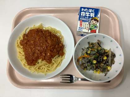 今日の給食は大人気メニューのスパゲッティミートソースと
