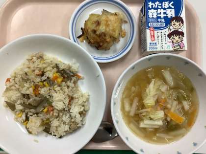 今日は彩りがきれいな鶏ごぼうピラフ、ポテトのチーズ焼き、さっぱり味の白菜スープでした🎶