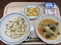 ⭐︎今日の献立⭐︎・高菜めし・みそ汁・さつま芋と黒ゴマのケーキ・牛乳今日のご飯は...