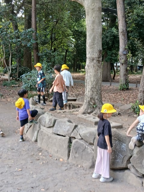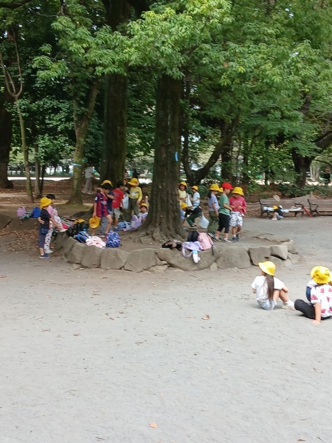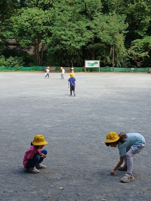 森の広場で遊んでいます。どんぐりを見付けたり、鬼ごっこをしたりして遊んでいます。