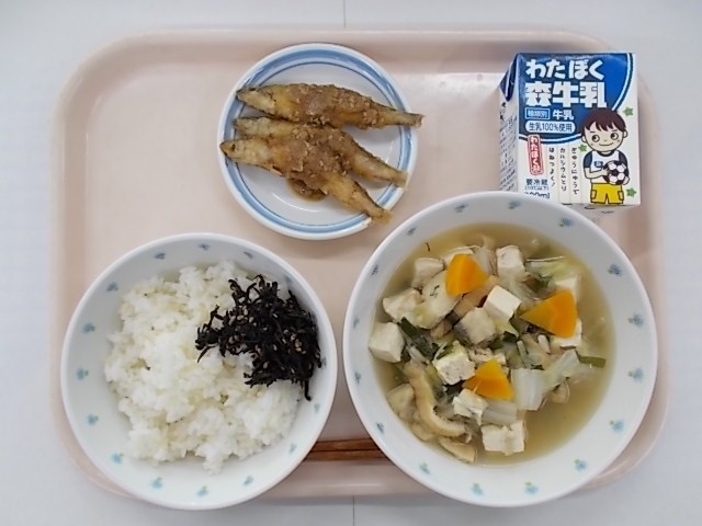 『ごはん しそひじきふりかけ 牛乳 鱈のちゃんこ汁 チカのごまだれ』