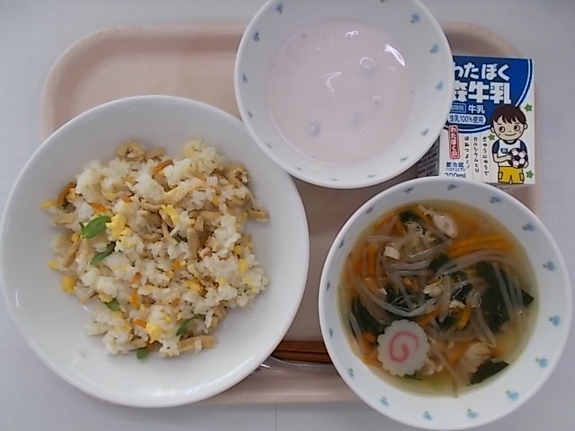 『五目ずし 牛乳 花丸スープ ブルーベリーヨーグルト ~前期終業式献立~』