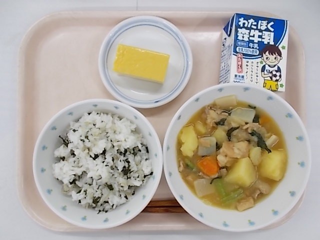 『じゃこわかめごはん 牛乳 肉じゃが煮 だし入り卵焼き』