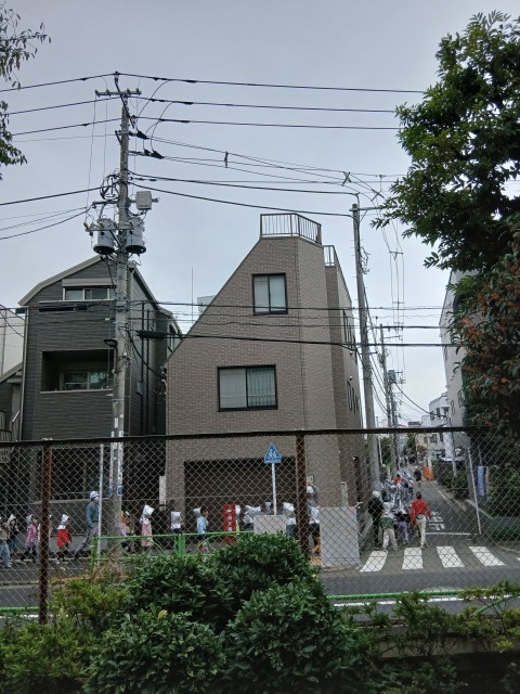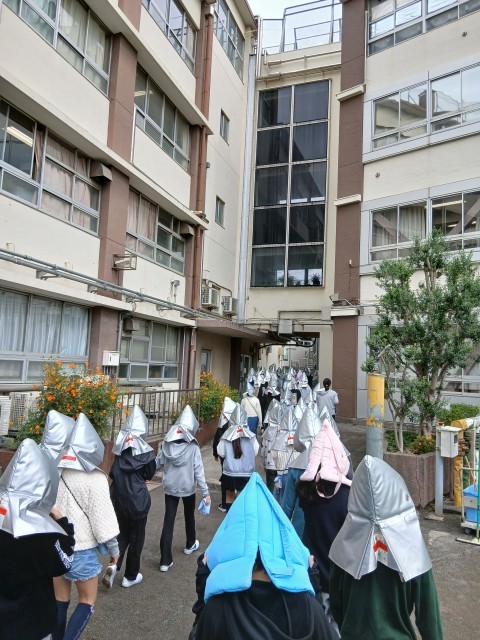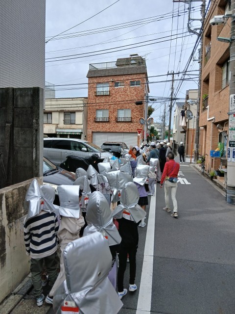 火災が起きたことを想定して、目黒南中学校への二次避難訓練をげっこうはらこども園と合同で行いました。押さない、走らない、話さない、戻らないの約束をしっかり守りって行動することができました。