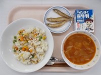 『ごはん じゃこふりかけ 牛乳 肉豆腐 三色浸し 柿』