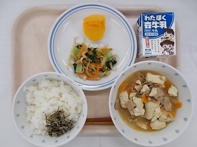 『ごはん じゃこふりかけ 牛乳 肉豆腐 三色浸し 柿』