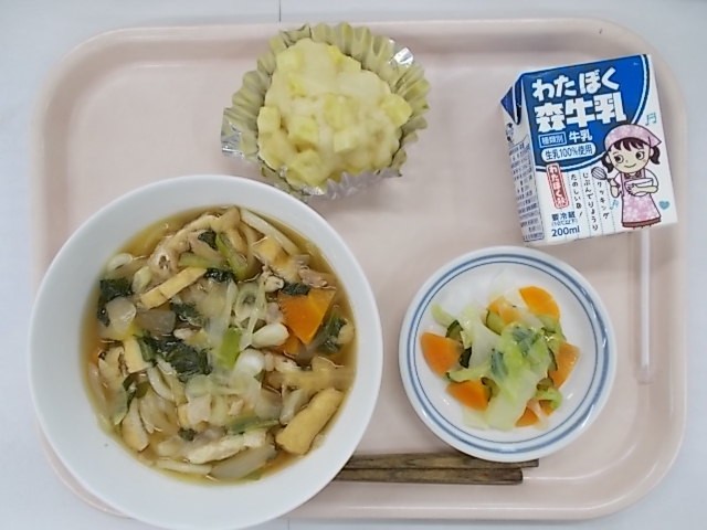 『鶏南蛮うどん 牛乳 かぶの即席漬け 鬼まんじゅう』