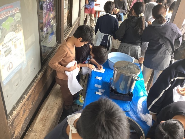 染料を鍋に入れ火をつけました。染め方の説明を聞いています。