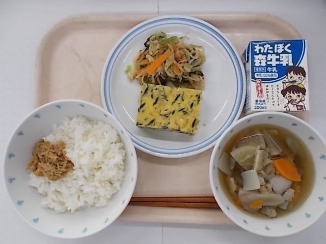 『ごはん 手作りなめたけ 牛乳 ふくさ卵 けんちん汁 おかか和え』