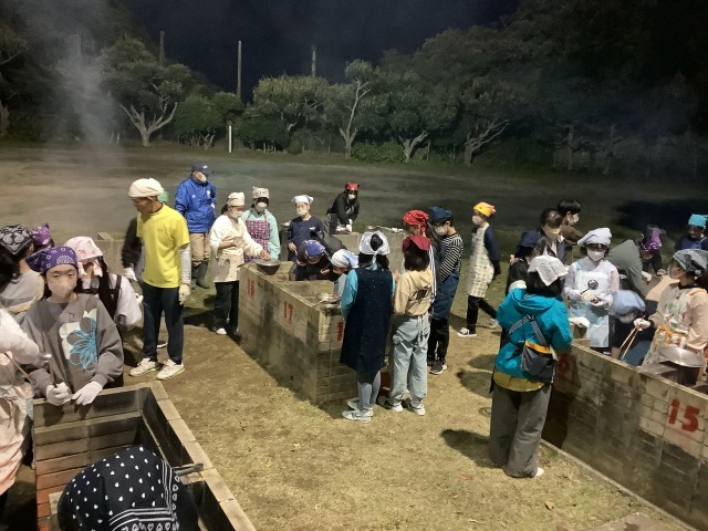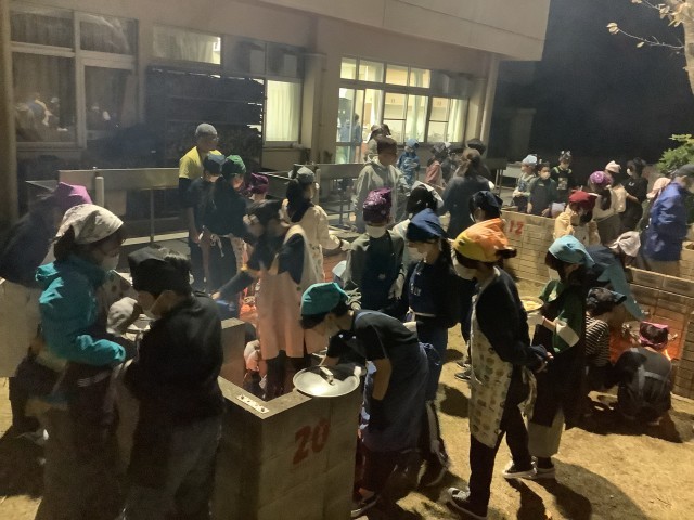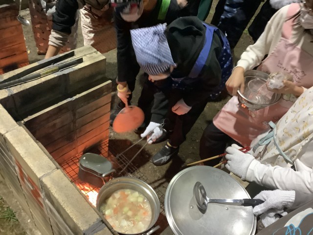 かまどに火を起こし調理を進めました。協力の成果で、あっという間にできあがりました。