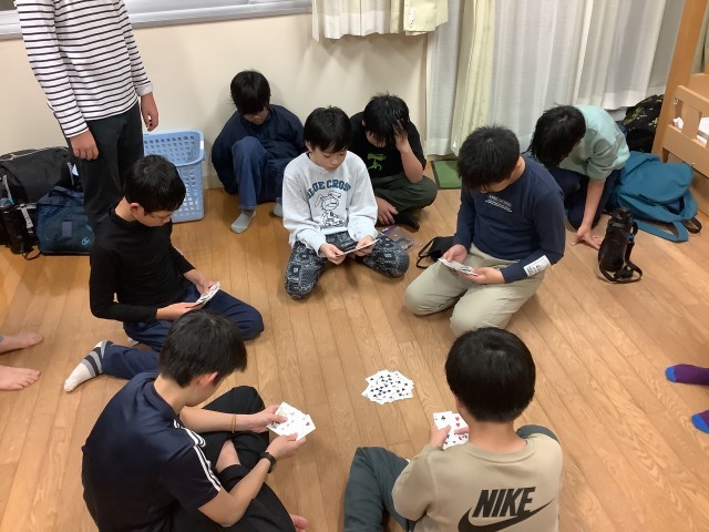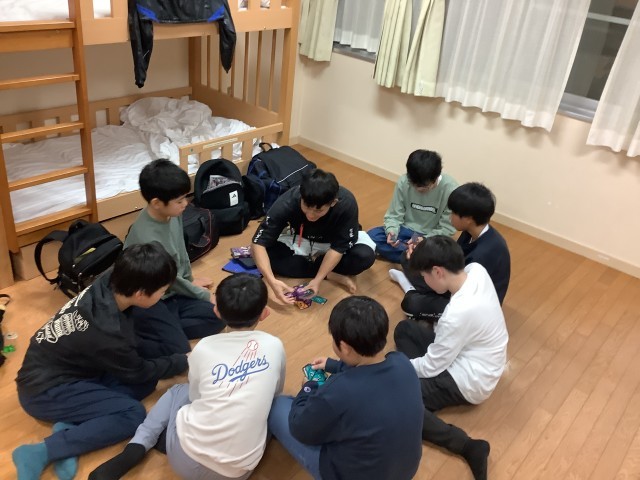 学園での自由時間を過ごしています。カードゲームをしたり、荷物の片付けをしたりして過ごしています。