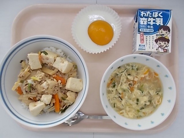 『四川豆腐丼 牛乳 たまごスープ おかしな目玉焼き』