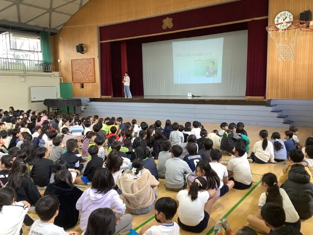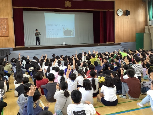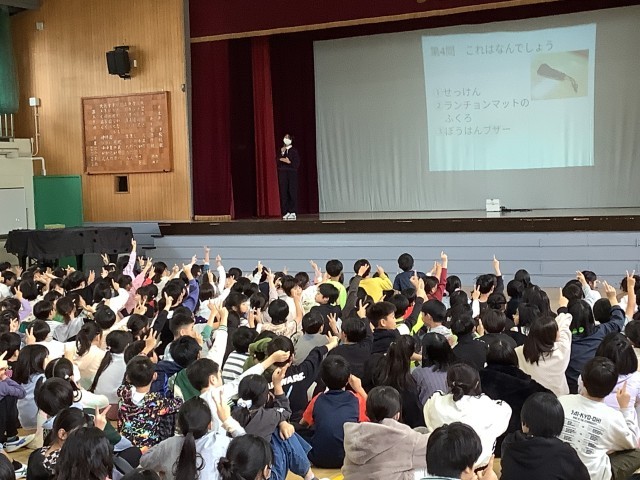 集会委員会による集会を行いました。身の回りにあるものをシルエットにして画面に写すだし、物の名前をあてあいました。