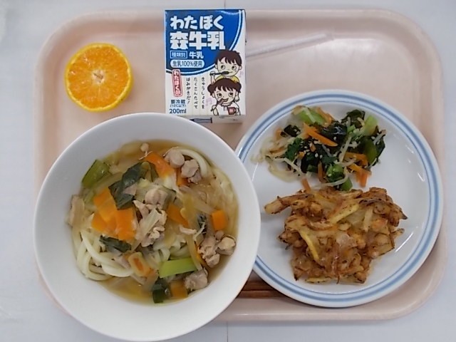 『五目うどん 牛乳 大豆とさつまいものかき揚げ もやしとわかめの和え物 みかん』