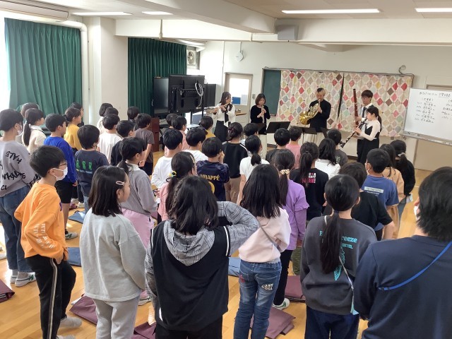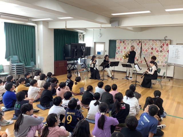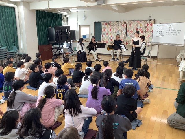 めぐろパーシモンホールによるアウトリーチプログラムが行われました。木管五重奏の演奏を楽しみながら聴くことができました。最後は演奏に合わせてみんなで校歌を歌いました。