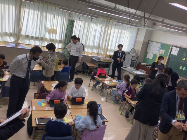 研究授業を行いました。4枚の色板を使って、図形を作りました。辺がぴったりと重なるように色板を動かしました。みんなよく考えていました。