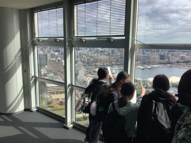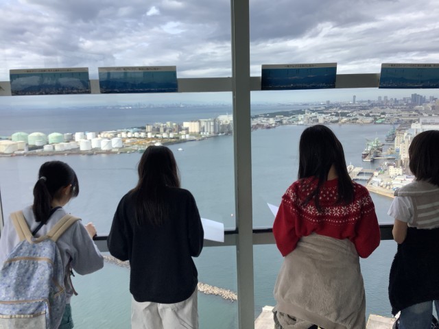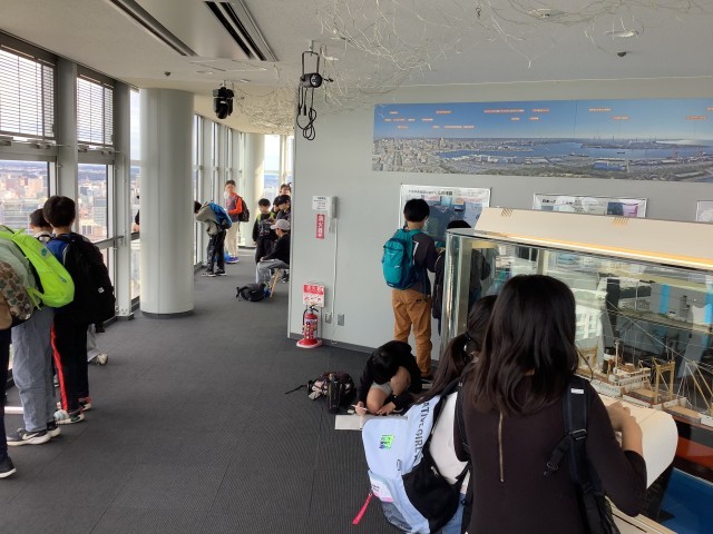 全体で説明を聞いた後、自由見学をしています。東京スカイツリー、大きな船が往き来する様子、広い製鉄場などを俯瞰できます。