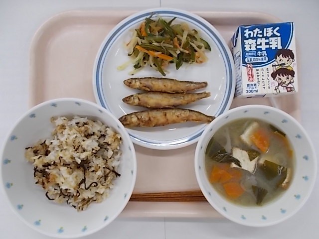 『昆布ごはん 牛乳 チカのこはく揚げ れんこんと人参のみそ汁 かみかみ和え』