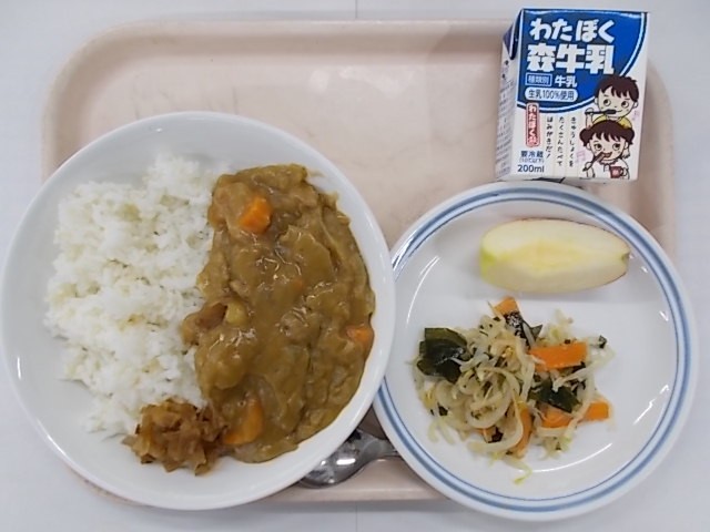 『カレーライス 福神漬 牛乳 わかめとじゃこのサラダ りんご』