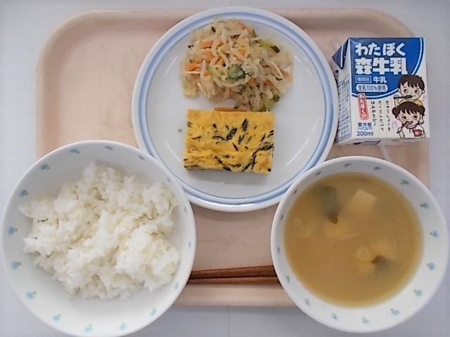 『ごはん 牛乳 ひじき入り卵焼き じゃがいものみそ汁 切干大根の中華サラダ』