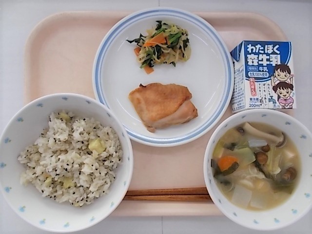『さつまいもごはん 牛乳 鶏の照り焼き 田舎汁 おひたし ~和食の日献立~』