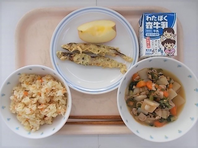 『にんじんごはん 牛乳 大根と豚肉のべっこう煮 ししゃもの磯辺揚げ りんご』